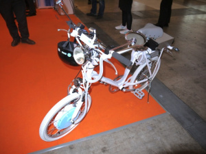 見た目は明らかにチャリで、荷台になにやら大きな弁当箱のような箱が載っているこちら。小さなブースですが「CEATEC JAPAN」に長崎県から出店した有安オートの自転車型電動バイク(Eサイクル)の「ISOLA」。つまり、電動スクーターですが、現代版モペットという雰囲気が漂っています。