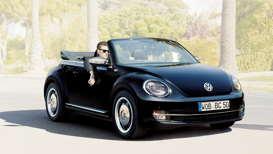 ボディカラーはシックなブラックで、ドアミラーはクロームで変化を与え、サイドスカートはボディ同色のブラック。サルサレッド&ブラックが目を惹くインテリアの「ザ・ビートル・カブリオレ50’s」は、ソフトトップもブラックで、クロームのホイールキャップでシックな雰囲気が魅力です。