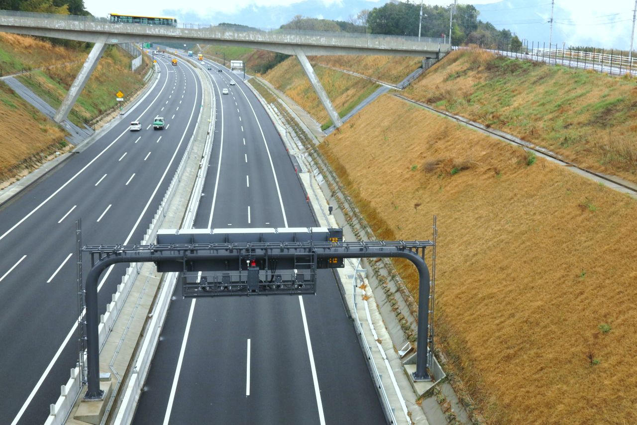 下り暫定2車線、上り3車線の65KP付近。ちょうど下り線にオービス(LHシステム)が設置されていますが、このままなら下り100km/hで変更なし、上りは120km/hの最高速度区間になることに…。