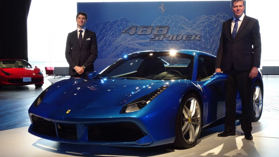 フェラーリ極東エリア統括マネージング・ディレクターのディーター・クネヒテル氏と、フェラーリ ジャパン&コリア代表取締役社長のリノ・デパオリ氏によってお披露目された488スパイダーは、まるで抜けるような青空と一体化するような新色ブルー・コルサのボディ。