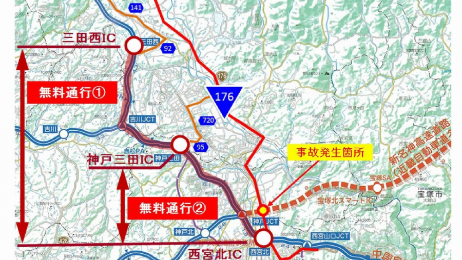 NEXCO西日本関西支社は、橋桁落下事故で通行止めとなっている一般国道176号を迂回して高速道路を利用する車両の通行料金を無料にすると発表しました。