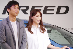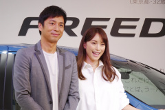 新しいフリードのCMに出演しているのはエビちゃんこと蛯原友里さん。同じくCMで共演する徳井義実さんとともにフリード発表会で登壇しました。