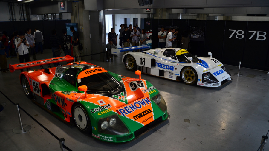 今回はホワイト/ブルーのマツダワークスカラーを身にまとった18号車が25年ぶりに公開。55号車と並んでディスプレイされ、往年のマツダファンの感涙を呼びました。デモンストレーション走行では、マツダ787Bの55号車を寺田陽次郎氏がドライブ。