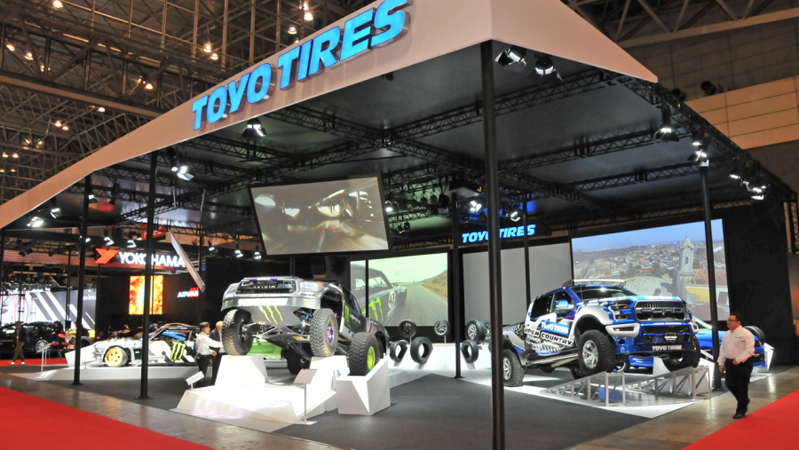 展示車両はケン・ブロック選手がドライブするフォード・マスタング(PROXES R888R装着)、BJバルドウィン選手のトヨタ・タンドラ(OPEN COUNTRY MT-R装着)、フォードF-150ラプター(OPEN COUNTRY M/T装着)、アウディTTRS(PROXES RR装着・日本未発売品)、ランドローバー・レンジローバースポーツ(PROXES T1 sport SUV装着・日本未発売品)、BMW M2( PROXES Sport装着)の各車。