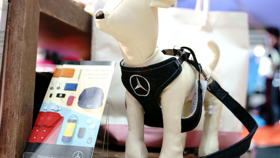 メルセデス・ベンツ日本からも、ベンツの象徴「スリーポインテッドスター」をあしらったドッグバギーやハーネスなどが出展されていました。キャンプ用品を搭載した「Vクラス」やベンツブランドのゴルフグッズなども展示されており、クルマで出かけるライフスタイル全般に関する提案という印象です。また「Travel With Dog」という冊子やSNSをサポートし、ペットとのドライブ旅行などに関する情報発信にも積極的な様です。