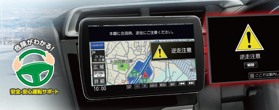 サービスエリアやインターチェンジ、ジャンクション付近の分岐・合流点を逆走すると、音声および画像で注意喚起をされるものです。これは、道路会社の保有する道路構造に関する知見と、自動車メーカーの保有するGPSナビゲーションに関する知見を合わせ、新たな逆走判定ロジックを開発し、市販のカーナビにも実装可能な技術として実現したとしています。