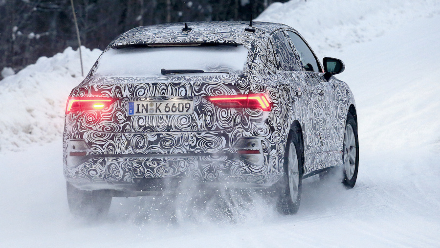 豪雪のスカンジナビアで雪けむりを上げて爆走するプロトタイプは、リアウィンドウは寝かされ、Bピラー以降からなめらかなルーフラインを描いている。テールライトやリアバンパーは「Q3」と似ているが、リアゲートの開口部が異なるほか、トランクリッドスポイラーも見られダイナミックなリアエンドとなりそうです。フロントエンドは、最強SUV「RS Q8」風のメッシュグリルや専用デザインのコーナーエアインテーク、バンパーを装備しています。