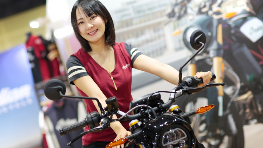話題の新モデル発表に沸くインディアン モーターサイクルのブースで出会ったのは、バイクの運転が好き、モトGP観戦にハマっているという早海芽衣子ちゃん。