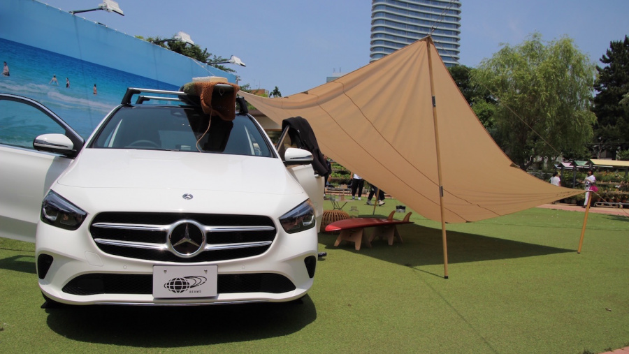 流行のグランピングなどを意識した車両展示は、新型Bクラスのコンセプトを分かりやすく伝えています。