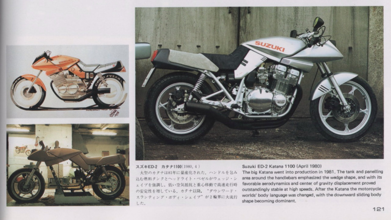 つまりカステンは、カウルの空力、ニーグリップ、タンク容量という機能要件から発想して、初代カタナをデザインした。機能を追求すれば美しくなるわけではもちろんなく、そこに彼の卓越した造形センスがあったことは間違いなのだが・・。