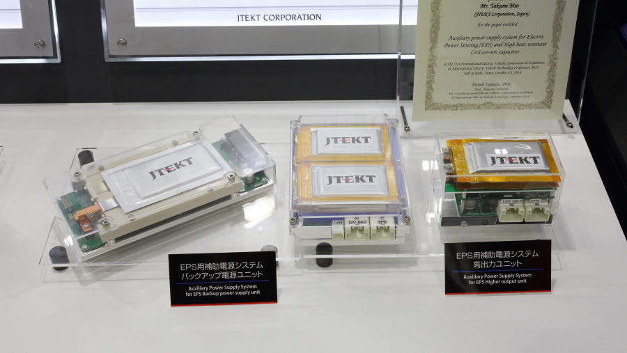 ジェイテクトが「人くる展」に初めて高耐熱リチウムイオンキャパシタを出展したのは、2017 年のこと(18年も同技術を展示)。同社は軽自動車から大型セダンまで、さまざまなタイプの電動パワーステアリング(EPS)を供給してきましたが、もっと大きな、例えば車重が3t を超えるようなSUV やピックアップトラックにEPS を適用しようとした場合、12V 電源では充分な軸力を発生させることができません。そこで、リチウムイオンキャパシタの6V を加えて18V に昇圧し、大型車にEPS を適用できるだけの出力を得ようという発想です。