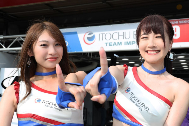 表彰台の裏ではIMPULのオイルをサポートするMobile 1のレースクイーンも平川選手の優勝を歓びます。
