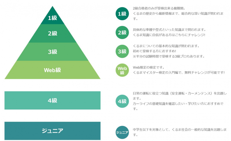 「くるまマイスター検定」は、最難関の1級から、中級レベルの2級、初心者向けの3級、中学生以下を対象としたジュニア検定、そして今回から安全運転やメンテナンスに関する4級も行われる。1級の受検には、2級に合格している必要がある。