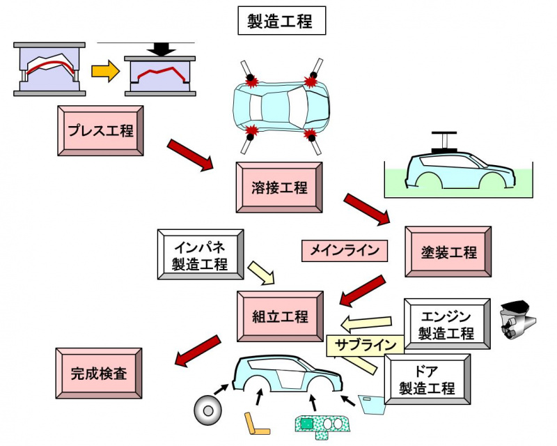 エンジンやインパネを構成する部品は、一般に外部部品メーカーで製造され、製造ラインのサブラインで組み立てられます。