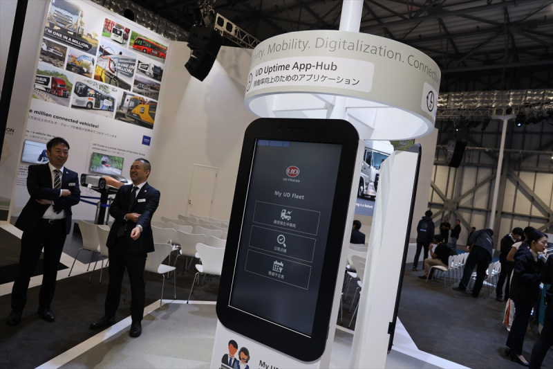 またUDトラックスを始めとするボルボ・トラックグループではグループ全体でコネクティングサービス搭載車の販売100万台を達成したとのこと。ドライバー、事業者、そしてメンテナンス工場などが情報を共有し安全で的確な体制でのトラックの運用を実現しています。