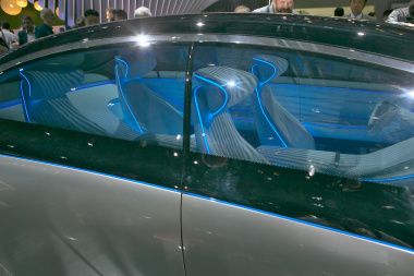 Vision EQSのインテリアは従来の材料に加えて、先進技術を駆使した材料も採用しています。シートに用いたクリスタルホワイトのマイクロファイバー「レザーDINAMICA」にはコントラストとなるダイヤモンドパターンのステッチ末端にローズゴールドのハイライトをあしらっています。また、ルーフライナーは「海洋ゴミ」プラスチックを一定割合含んだ特別ケースとなっています。