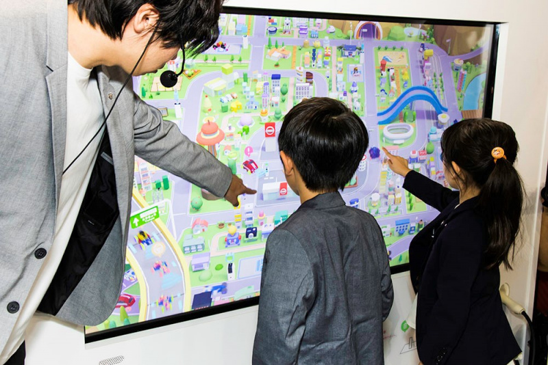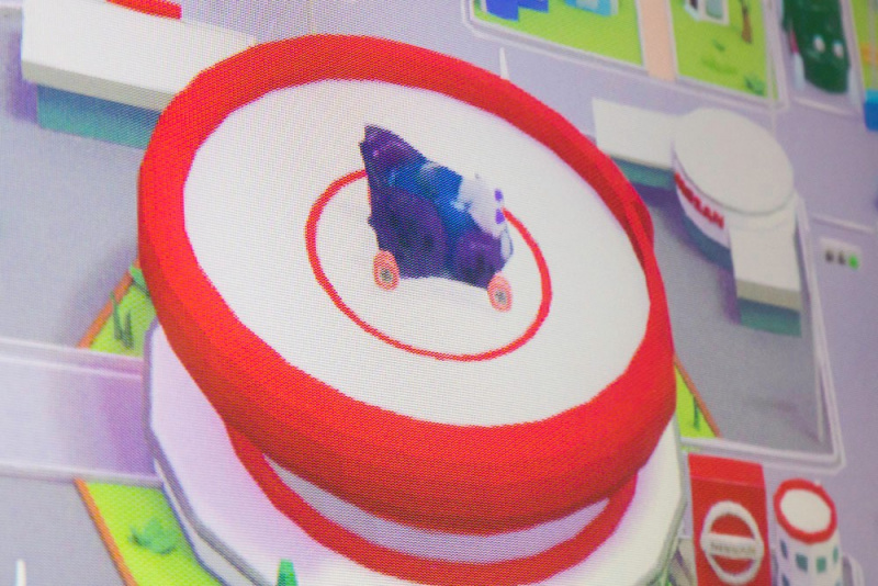 3Dスキャンが終わると、大型モニターに映し出された町の中央に、子どもたちが作ったコンセプトカーが登場! まるで本物のモーターショーみたいな素敵なステージです。ステージを降りたコンセプトカーは町の中をあちこち走りまわり、クルマがどんなふうに動き、どんなふうに見えるのかを確認することができます。