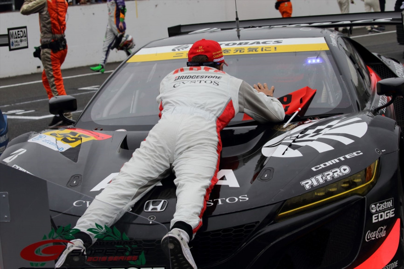 チャンピオンとなったARTA NSX GT3がパルクフェルメにやってくると、待ち構えていた高木真一選手がマシンに飛びつきます。
