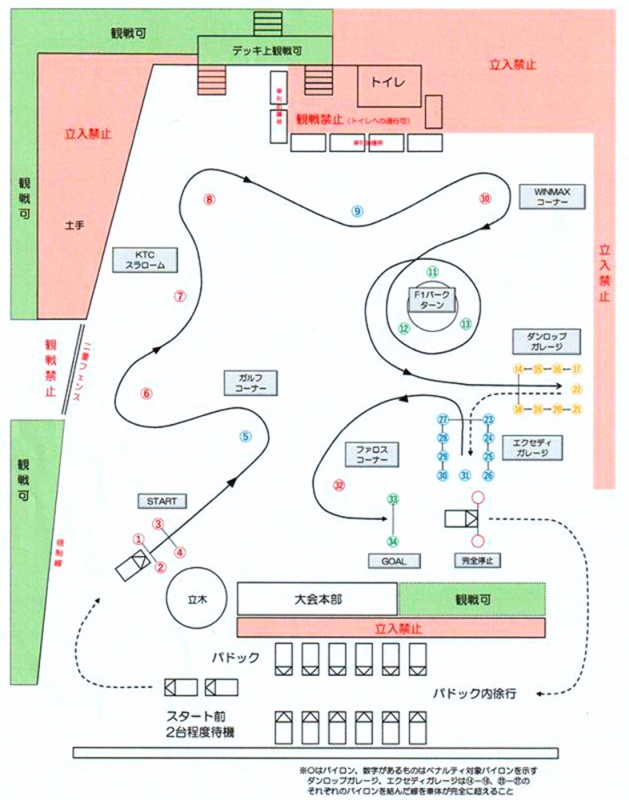 今回の車山オートテストのコースは、この図のとおり。各コーナーにネーミングライツが設定され、スポンサーの名前がつけられていたのが印象的でした。