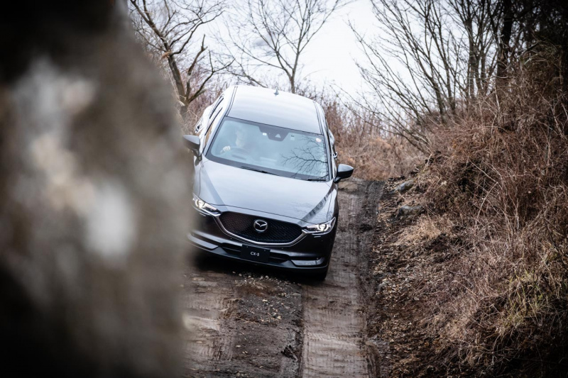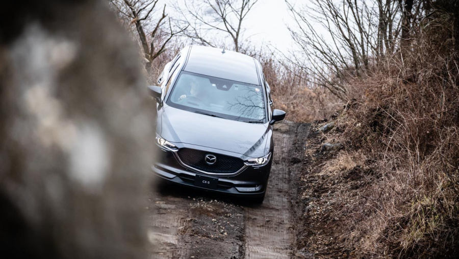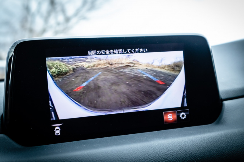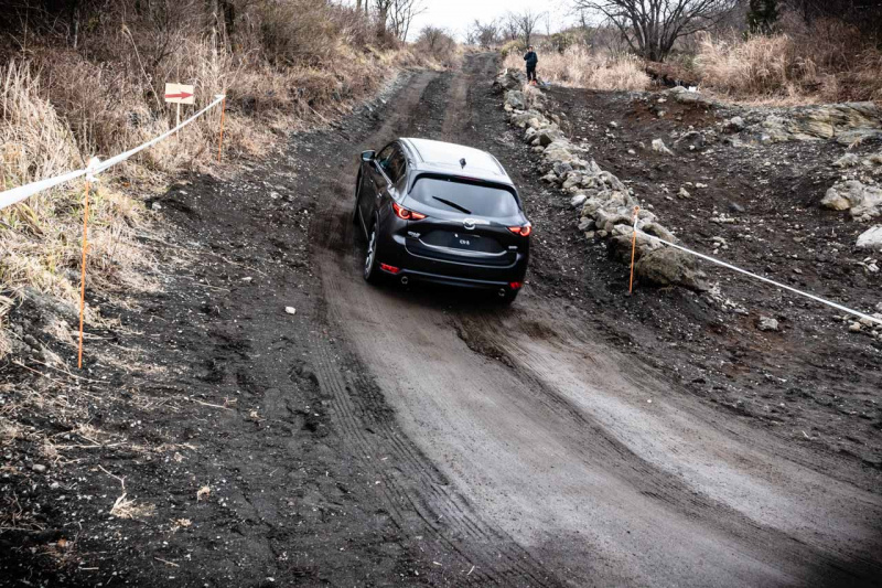 オフロード試乗会ではCX-8に続きCX-5に乗り込み、急勾配を一気に駆け上がり、急坂をクリアし、狭いコースをゆっくりと降りてくるというコース。シートハイトを少し高めにしてもボンネットの先までは見きれず、前方および左右の視界は、スクエアなクロカン4WDのような見切りの良さはありませんが、サイド/リヤだけでなくフロントも映し出すモニターの助けも借りながらの試乗になりました。