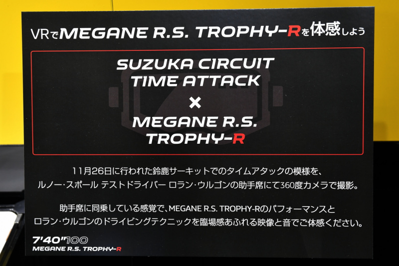 ルノー・スポールのテストドライバーであるロラン・ウルゴン氏が、鈴鹿サーキットで2019年11月26日に、ルノー・メガーヌR.S.トロフィーRでタイムアタックをした。その際に、アタック車の助手席に360度カメラを設置していたが、その映像を体感できる機会が、今回東京オートサロン2020のルノー・ジャポン・ブースで設けられた。