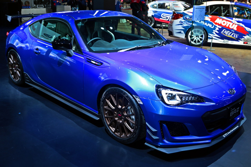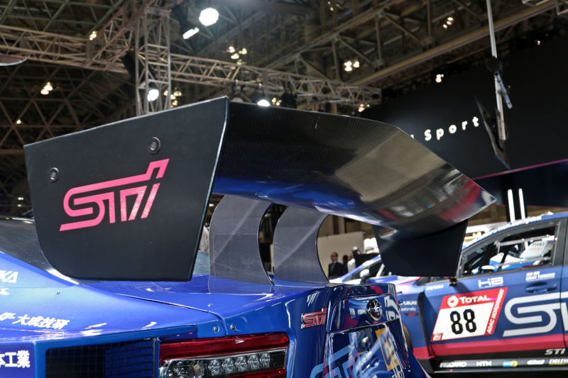 SUBARU/STIブースで注目を集めるBRZは、SUPER GTに参戦中のBRZ GT300マシンで得られた空力効果をフィードバックしたアイテムが数多く装備されています。