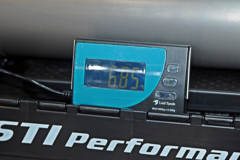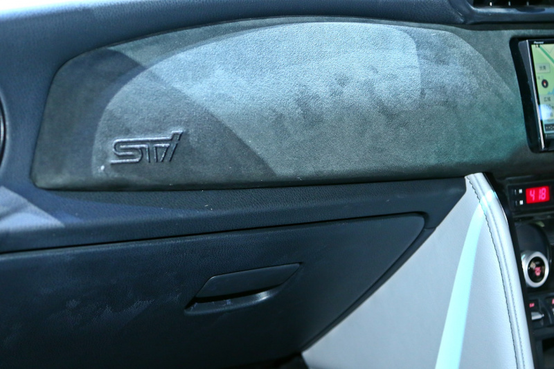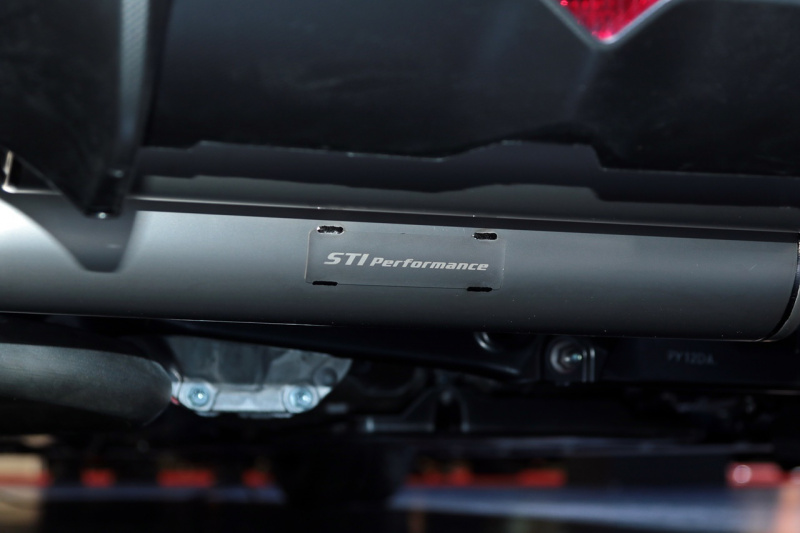 リヤの下回りを覗くと、STIパフォーマンスエンブレムが装着された見慣れぬマフラーが装着されていました。これは試作のSTI製チタンマフラーで排気効率はもちろん、軽量化にも貢献。