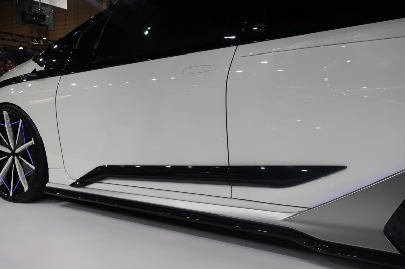 「ボディをより低重心に見せたいという意図を考えると、フロント下部をブラックにした場合、逆にアッパーな感じが出てしまうんですね。その分、ボディ下部についてはフロントからリアまでシルバーパーツを回していて、ここはモデリスタらしいクオリティ感を出したところです」