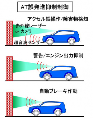 すべてのメーカーは、アクセルとブレーキの踏み間違い事故防止のため、AT誤発進抑制制御を採用しています。誤発進抑制制御のためには、車両の前方または後方の障害物を正確に認識する必要があります。障害物の検知手法はメーカーによって異なりますが、超音波センサーか赤外線レーザーが多用されています。