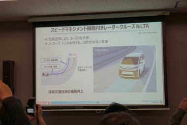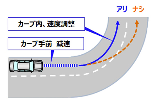 ③「スピードマネージメント機能付きレーダークルーズコントロール&LTA」は、LTA(レーントレーシングアシスト)の作動時、カメラによる白線認識にAI技術を活用し、カーブの大きさに合わせてあらかじめ減速し、カーブ走行時の横Gを常に一定にし、より安定し快適な走行を実現するとともに、より半径の小さなカーブやトンネル内でも途切れの少ない運転支援を可能にする機能。