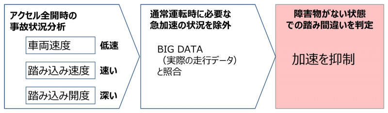 右折時や一時停止後など、ドライバーが実際に急加速を必要とする状況を除くことにより、異常なアクセル操作状況を特定して割り出し、障害物がなくても加速を抑制する設定とされています。