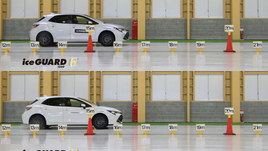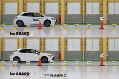 横浜ゴムのウインター試乗会では、最新のスタッドレスタイヤ「アイスガード6」を使って、新品と4年経過相当品の試乗を行いました。4年経過相当品というのは、実際に4年が経過したものではなく人工的に4年分のストレスをくわえたもの。ただし4年間使用した状態ではなく、新品を4年間放置した状態相当なので、山はたっぷりとあるものです。新品と4年経過相当品を屋内氷盤路で試乗した印象は、「何も変わらない」でした。スタート時のトラクション、ブレーキング時の減速G、制動距離、スラロームの反応……すべてが新品との区別が付かない状態でした。