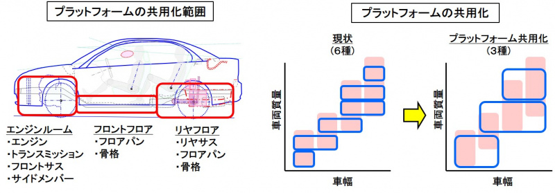 自動車メーカーは、ユーザーの多様性や環境規制等の厳しい要求に、低コストで効率良く応えるため、プラットフォームの共用化に取り組んでいます。プラットフォームとは、ボディ内外装部とアッパーボディを除いた骨組み(土台)を指します。