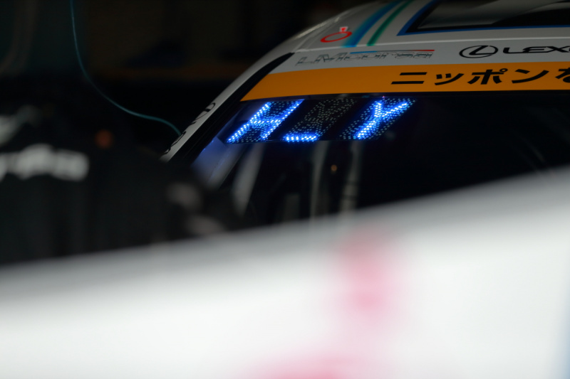 この新しい識別灯の表示ですが、初日午前の走行ではイニシャルの間にアンダーバーが入っていましたが、午後の走行以降ではそれがなくなりイニシャル2文字と順位の交互表示になっていました。またGT500は白、GT300は青での表示となっていました。