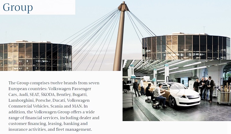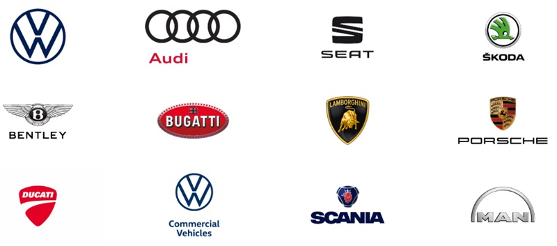 欧州7か国の12ブランド(VW乗用車、アウディ、セアト、シュコダ、ベントレー、ブガッティ、ランボルギーニ、ポルシェ、ドゥカティ、VWコマーシャルビークルズ、スカニア、MAN)で構成されるVWグループ。