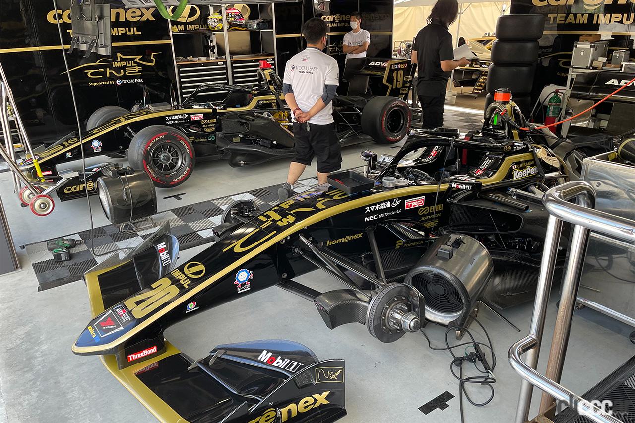 Team IMPULのピットでは黒の外装をまとう20号車が、ル・マン24時間レースを制覇して戻ってきた平川を待っている。その奥には僚友、関口の19号車が並ぶ。