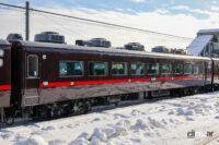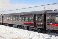 「SL冬の湿原号」の客車は5両編成で、標茶側から1〜5号車の順で連結。1・3〜5号車は元ブルートレインの14系客車、2号車は旧形のスハ43系客車で構成しています。車体カラーは戦前の客車をイメージして茶色に赤帯となっています。