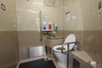 三原側の先頭車には車椅子対応の大型洋式トイレを設置。トイレの向かい側をフリースペースとしています。