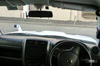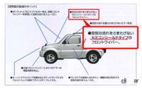 筆者の旧ジムニーシエラなんてひどいんですぞ! 室内からはセラミック塗装の少し上が停止位置。外からは丸見えにしておいて、当時の資料では「空気の流れをさまたげないセミコンシールドタイプのフロントワイパー」と謳っているのだもの。