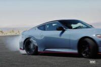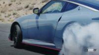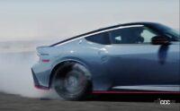 現段階でNISMOの価格やパワー、性能の詳細を一切発表していませんが、44秒の短い動画では、ドリフトチャンピオンのクリス・フォースバーグ氏が、クローズドサーキットでテールスライドを披露。後輪のホイールアーチから煙が立ち込める様子が映し出されています。