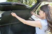 積んだ荷物が外から見えないよう、荷物隠しのカバーが備わっていますが、その後端をバックドア側にフックでひっかけ、バックドアを開けたときはカバーが上がるようになっています。不要のときはリトラクターで引き込まれ、本体そのものを外し、フロア下に収納することもできます。