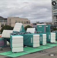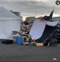 ナニゴト~!?と思ったら、明け方の強風でテントや仮設トイレがブッ飛んでしまったとのこと。