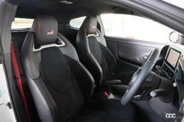 これは、シートレールを変えた…とかではなく、ボディ自体を変更して位置を調整したとのこと。「GRヤリスは小さい車なので、旧型でも下げられるところまではやっているんですけど…それ以上下げられなかったんですよね。シート本体は進化型も旧型も同じ。同じシートとは思えないくらいでしょ?」と、座面の高さはトヨタでも開発ドライバーから散々言われていたのだそうです。