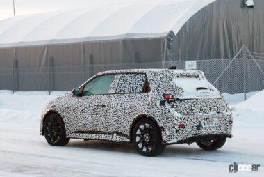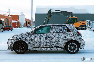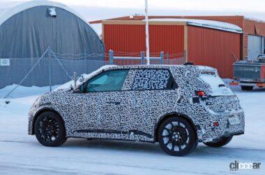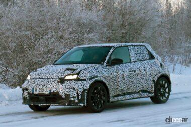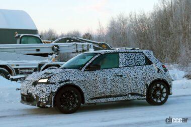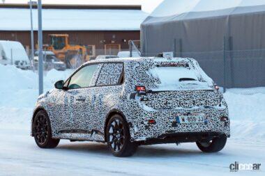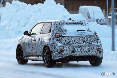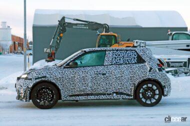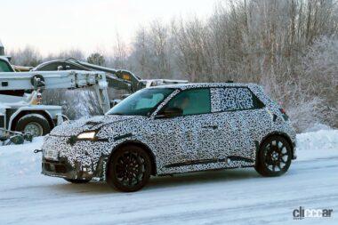 厳冬のスカンジナビアで捉えたプロトタイプですが、後部ドアノブはCピラーの根本に隠されており、ルノー5と同様に量産型では、4枚のドアを装備しています。またボディをローダウンしてフェンダーフレアが装着されており、ボディがワイド化されることを示唆しています。