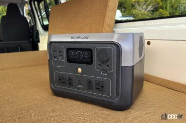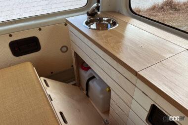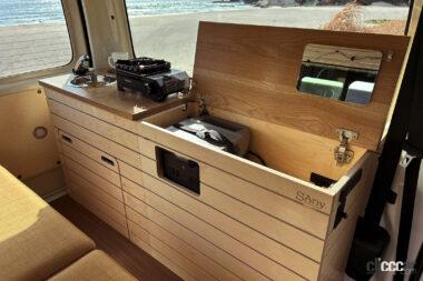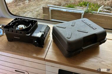 室内後方の左側には、10Lのタンクを装備したシンクと、ポータブル電源の入ったキャビネットを配置します。しかも、簡単な調理ができるイワタニ製カセットコンロ付き。キャビネットは、パソコンなどを置けるディスク代わりにもできることで、ワーケーションなどにも利用できます。