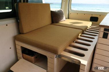 さらに常設のベッドは、簡単に1人用から2人用に変更することも可能。サイズは1人用で750mm×1800mm×350mm、2人用に展開すると1060mm×1800mm×350mmとなります。また、1人用のベッドはソファにも使え、仕事などでデスクを使用するときの椅子にすることもできます。さらに、ベッド下にはキャンプグッズなどが入れられる収納スペースも確保し、積載性も抜群です。