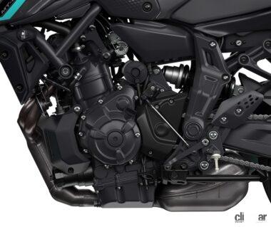 なかでもMT-07は、最高出力54kW(73ps)/8750rpm、最大トルク67N・m(6.8kgf-m)/6500rpmを発揮する688cc・2気筒270度クランクエンジンを搭載。
