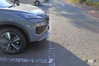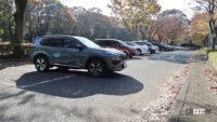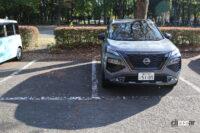 それはさておき、プロパイロットパーキングは狙うスペースへの収容も正確で、左右ドアミラーを見ればボディと駐車枠との間隔も左右均等・・・ではありましたが、駐車完了後にクルマを降りて外から見ると、最終的には枠線の中央からわずかに右にオフセットしていたのはご愛敬。何度か自動切り替えししている間に右寄りになったようですが、まァ許容範囲です。先端も枠線に対してちょうどいい位置に収まっています。いずれにしてもヘタなひとの入れ方よりよほどきれいに収まっており、初めてプロパイロットパーキングを使ったひとは「やるな、エクストレイル!」と思うでしょう。