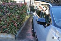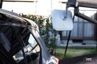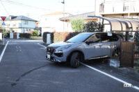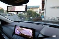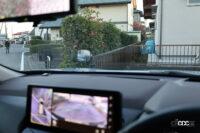 画像の画像=写真の中のモニター画面では、あらかじめひとが後ろに立ってのけ反ることなく自然な姿勢でバックドアが開けられる位置を定めてエクストレイルを停めているのですが、このときの後ろの車両との距離は筆者実測でわずか795mm。開閉中の最大張り出し量に至っては、自分で測り間違えを疑いたくなる、たったの388mmでした。
