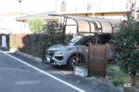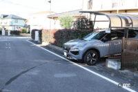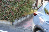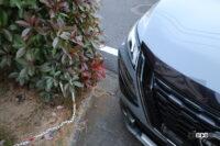 そうはいっても大きめサイズであることには違いないので、自宅の車庫入れに限っては運転席ドアの開けしろを残すべく、スペースに対して左寄せするほうがいいでしょう。そのために、左後輪&リヤボディ左は入口左側の壁なりフェンスなりにぶつけんばかりのスレスレまで寄せるとちょうどいい。だいたい、車庫前の道幅と前輪切れ角にもよりますが、幅広のクルマならどんなにスレスレまで攻めても最後はスペース幅の中央付近に収まるものです。